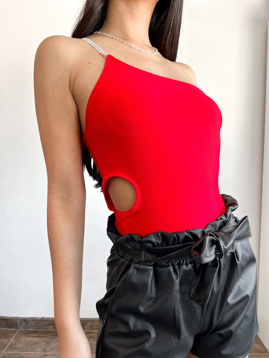 De microfibra un hombro con detalle de strass, abertura en los costados y broche a presión