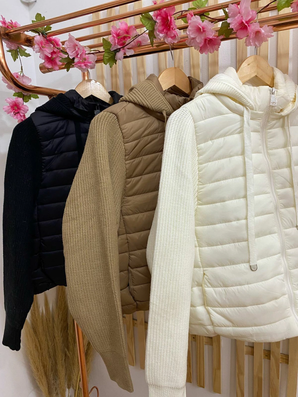 Campera combinada con mangas y capucha desmontable tejidas al tono. Art: 7293