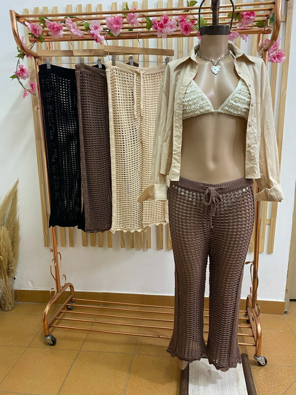 Pantalón calado playero con lazo regulable y detalle de franja tejida en los laterales. Art: 2184